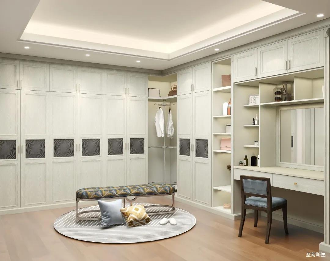 ▲业主喜欢低调轻奢的空间格调,设计师从功能出发,赋予空间舒适的感受,打造专属的衣帽间,满足业主日常买买买的储物喜好。同时也将艺术元素融入美式现代风格,利用空间的色彩、纹理、家具、配饰、光线等表达空间情绪,再以黄铜金属加持,营造温馨惬意的家居睡眠氛围。
