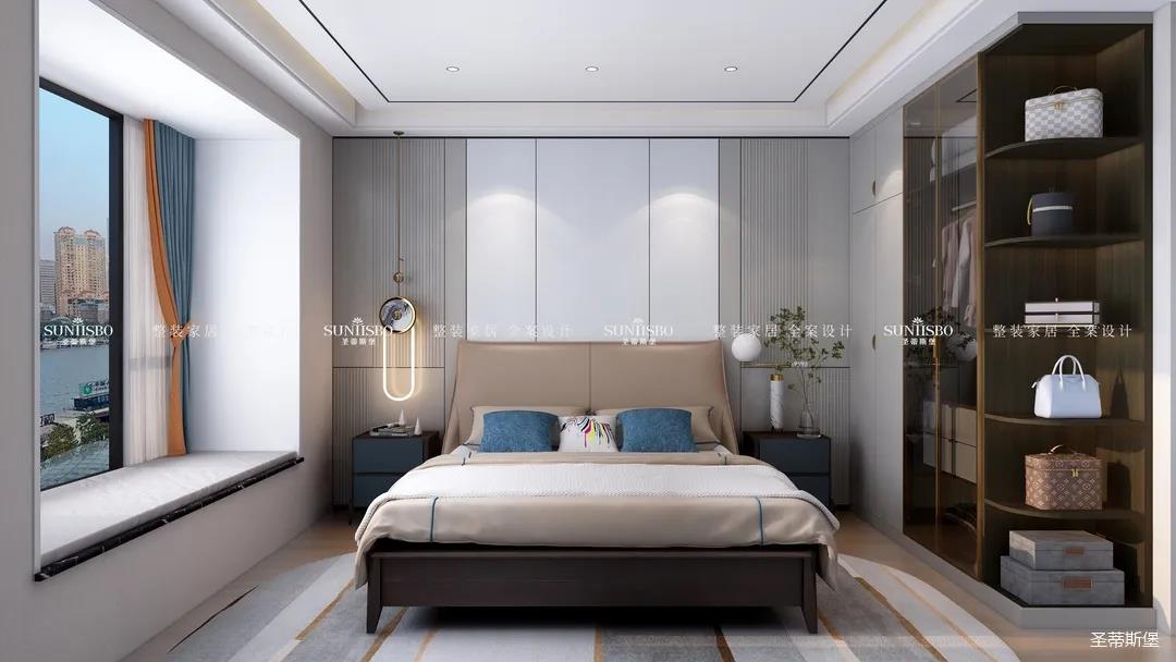 卧室把自然光线纳入空间。稳重的浅咖色床屏搭配柔和的灰白护墙,渲染了空间去繁从简的设计。品质精致的床品面料触感自然柔软,真皮质地的家具匹配空间气质,为业主营造了舒适惬意的休憩空间。